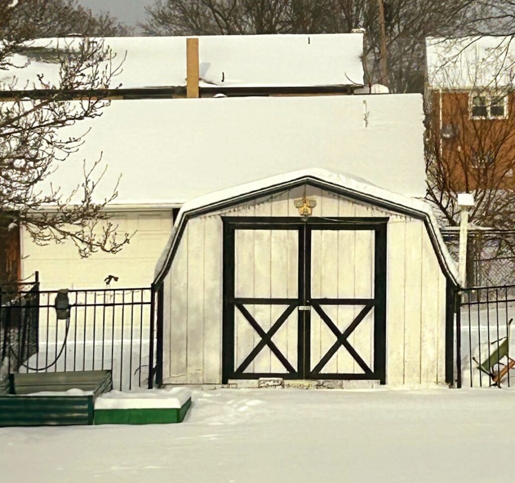 The shed in Beau’s yard is covered with lots of snow. On that front green step, you can see how much snow fell.
