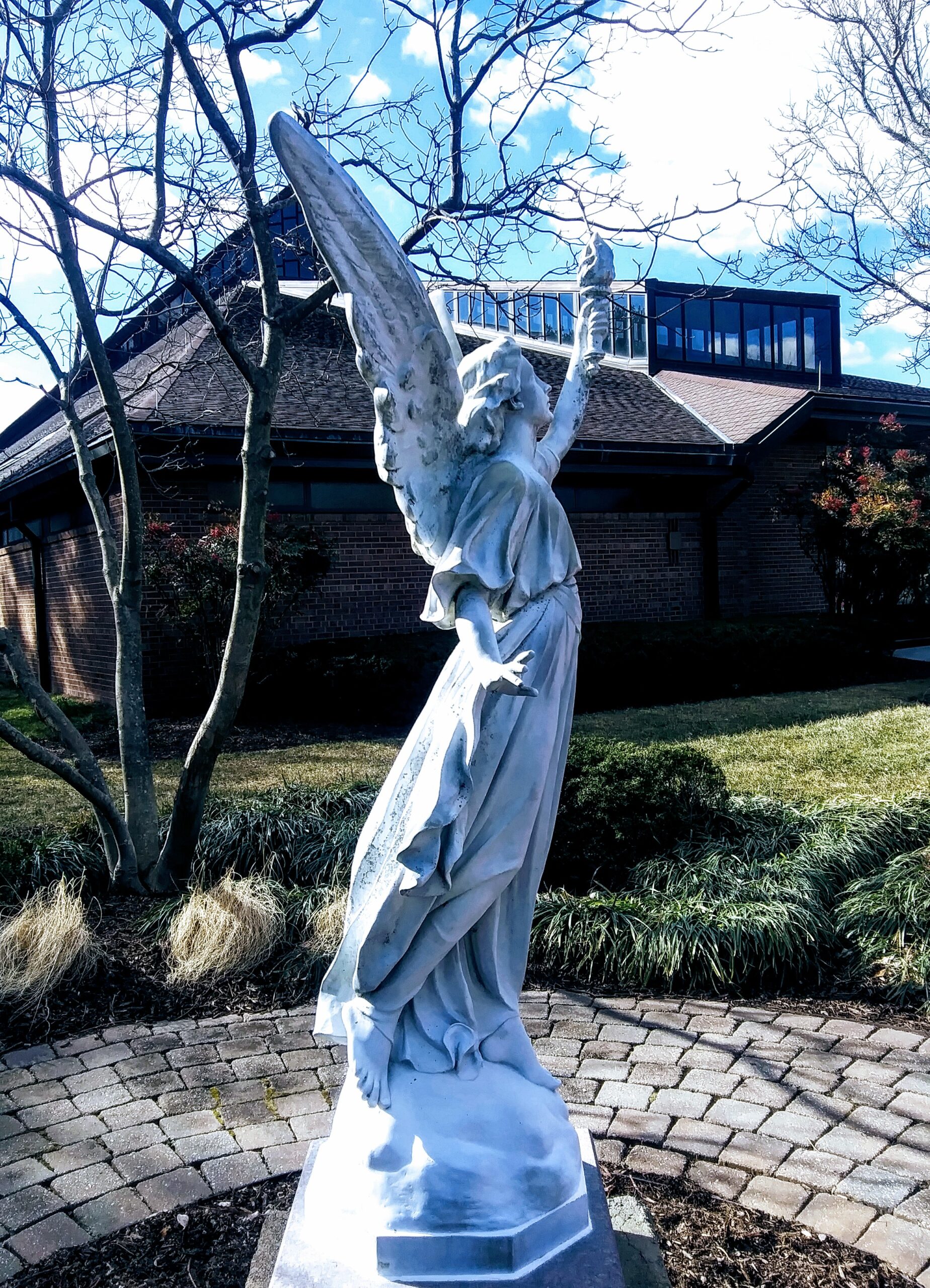 There is a marble plaque underneath the angel statue stating that it was part of an Eagle Scout project back in 2004.
