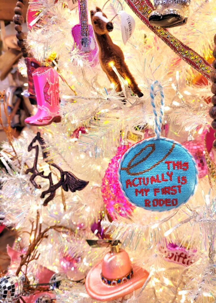 I like the needlepoint ornament stating, “This Actually is My First Rodeo”. There are, also, lots of horses and pink cowboy boots/hats on this holiday tree.