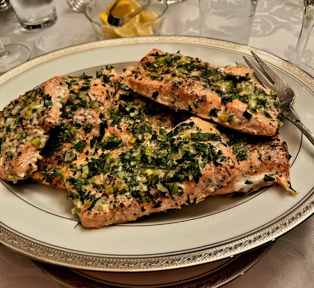 The main course is pink salmon covered with fresh Greek Tzatziki Sauce. Online research, states Tzatziki sauce tastes refreshingly cool, creamy with prominent flavors of cucumber, garlic and dill plus other herbs. All in all, it is a light flavorful sauce perfect for meats, fish, vegetables or even warm pita bread.