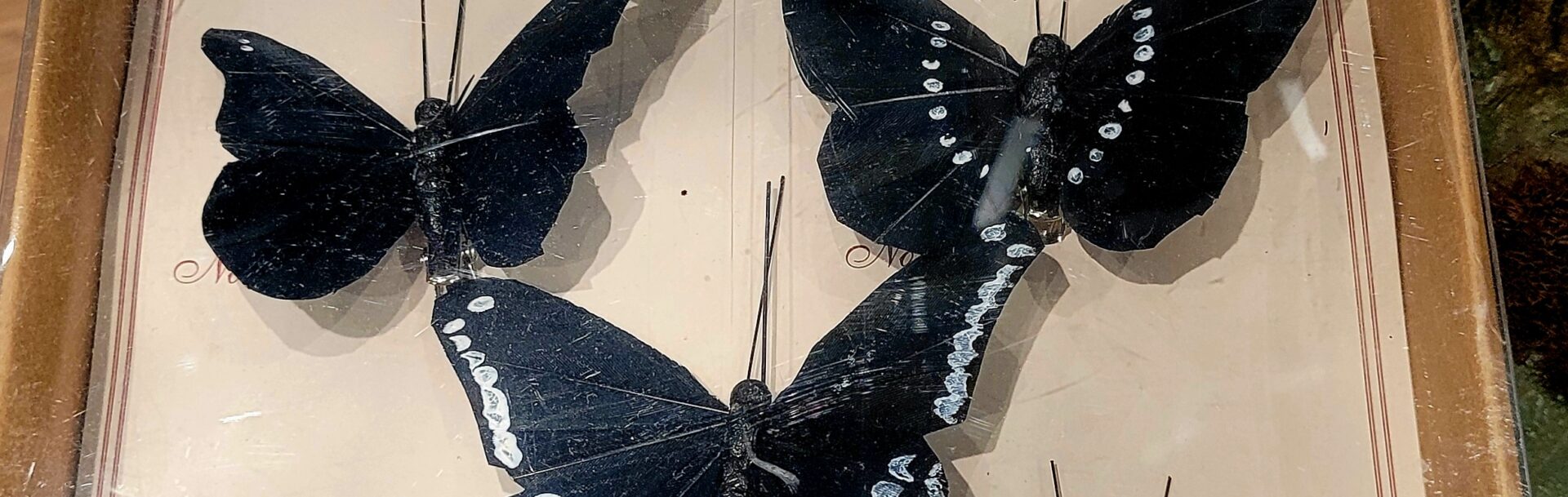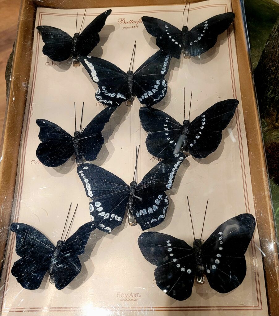 A box full of different silk black butterflies. A grouping of these black butterflies would look terrific on many Halloween hats.