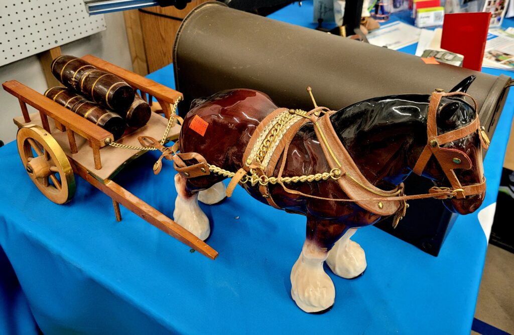 This is a very detailed horse and wagon toy or decorative piece. The halter on the horse is leather, and it carries six wooden barrels in the wagon. It is a nice piece if you are buying a gift for an equestrian. It looks similar to the Scottish pieces I have seen online.