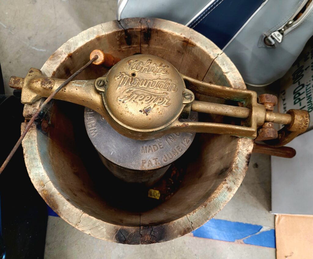 The vintage White Mountain Freezer ice cream maker uses the patented triple-motion dasher system for making homemade ice cream. There were two additional sets of blades which scraped ice cream from the sides of the canister. This action whipped more air into the ice cream base and prevented large crystal from forming. It was a simple design but worked well. Made in the USA, patented, I believe, June 12, 1923. I think this piece was located near the front of the store and I’m not sure if all the parts are still there. Still, it is great conversation piece for those who love ice cream.
