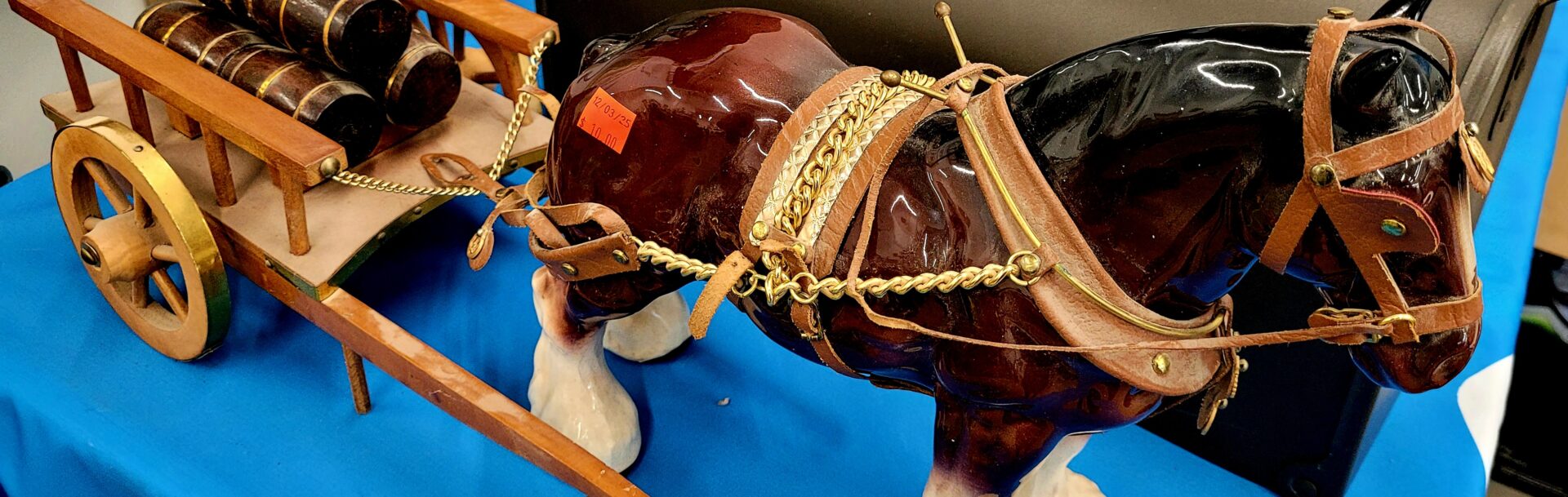 This is a very detailed horse and wagon toy or decorative piece. The halter on the horse is leather, and it carries six wooden barrels in the wagon. It is a nice piece if you are buying a gift for an equestrian. It looks similar to the Scottish pieces I have seen online.